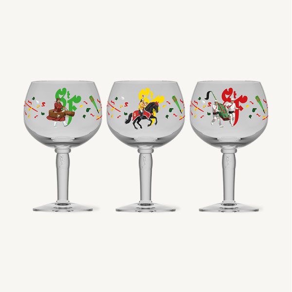 Dive into the rich brewing heritage of Mons with this exclusive set of three glasses, each featuring a unique design. Every glass pays tribute to local tradition and folklore, reflecting the festive spirit of the Doudou — an iconic celebration that has brought the people of Mons together for generations. An authentic and characterful collection for lovers of heritage and abbey beers. Ideal for tasting our 5 abbey beers. Content: 3 x 25 cl Height (mm): 160 Diameter (mm): 78.5